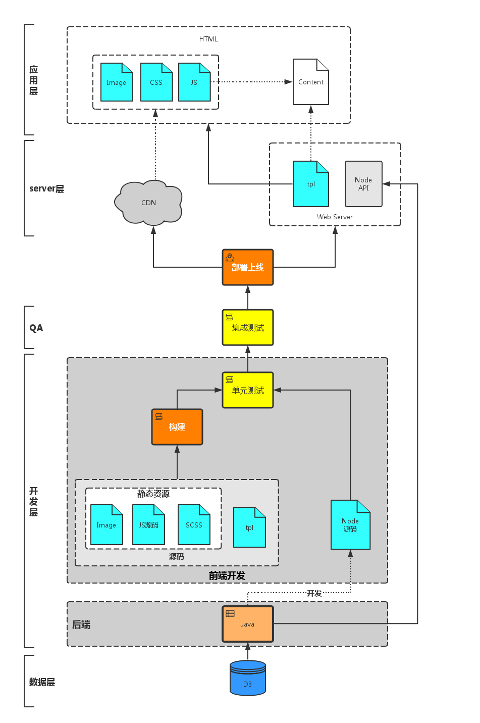 上图是一个比较成熟的前后端协作体系。当然,目前由于Node.js的流行开始普及大前端的概念,稍后会讲述。